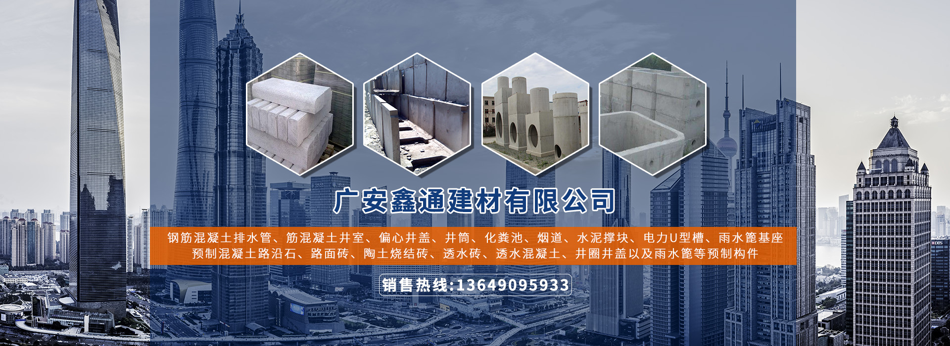 廣安鑫通建材有限公司是一家集研究、銷售:鋼筋混凝土排水管;筋混凝土井室、偏心井蓋、井筒;鋼筋混凝土化糞池、煙道、水泥撐塊;鋼筋混凝土電力U型槽、雨水篦基座;預(yù)制混凝土路沿石、路面磚;...